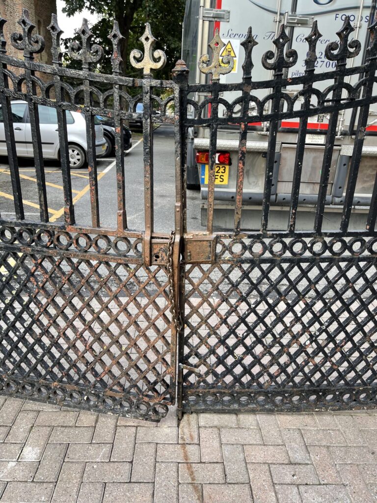 The second gate faced on to Love Lane. This gate was misaligned and included broken hinges. The Forge replaced the hinge and add an adjustable feature so that the gates could be aligned.